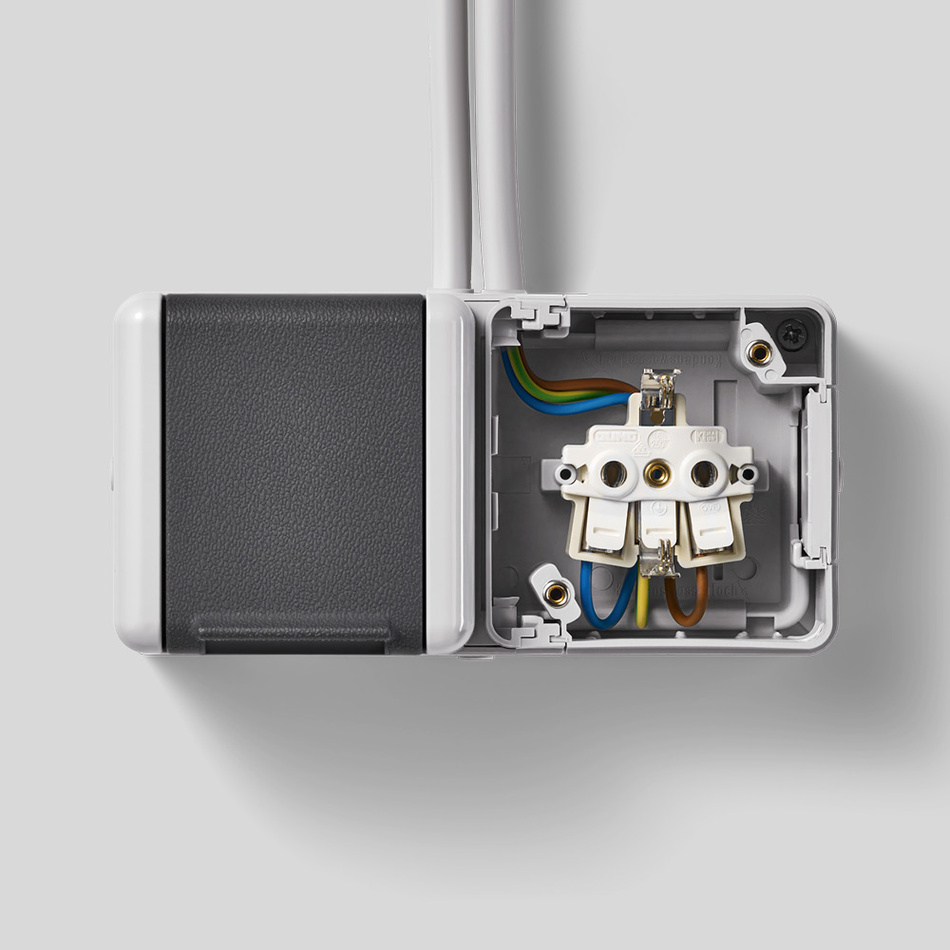 Der Trennsteg im Aufputz-Programm WG 800 von JUNG macht das möglich. Das spart Zeit und Ressourcen bei der Montage. Klassischer Anwendungsfall für den Trennsteg ist der Wäscheraum. Waschmaschine und Trockner sind leistungsstarke Verbraucher. Beide Geräte müssen daher auch einzeln abgesichert werden. Die nötigen getrennten Stromkreise können in einer SCHUKO® Steckdose 2-fach mit Trennsteg installiert werden. Damit erfüllt die Doppelsteckdose normative Anforderungen, Stromkreise von Verbrauchern mit hohen Leistungen zu separieren.